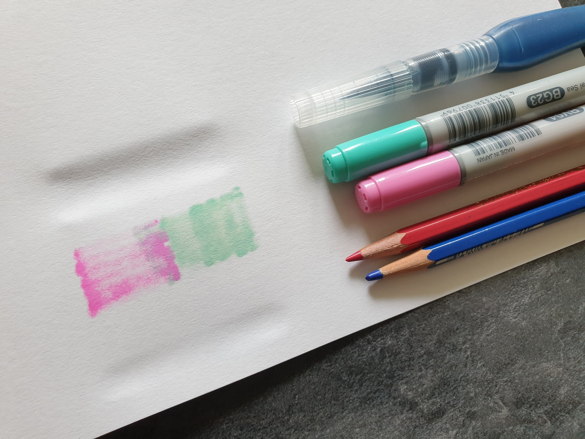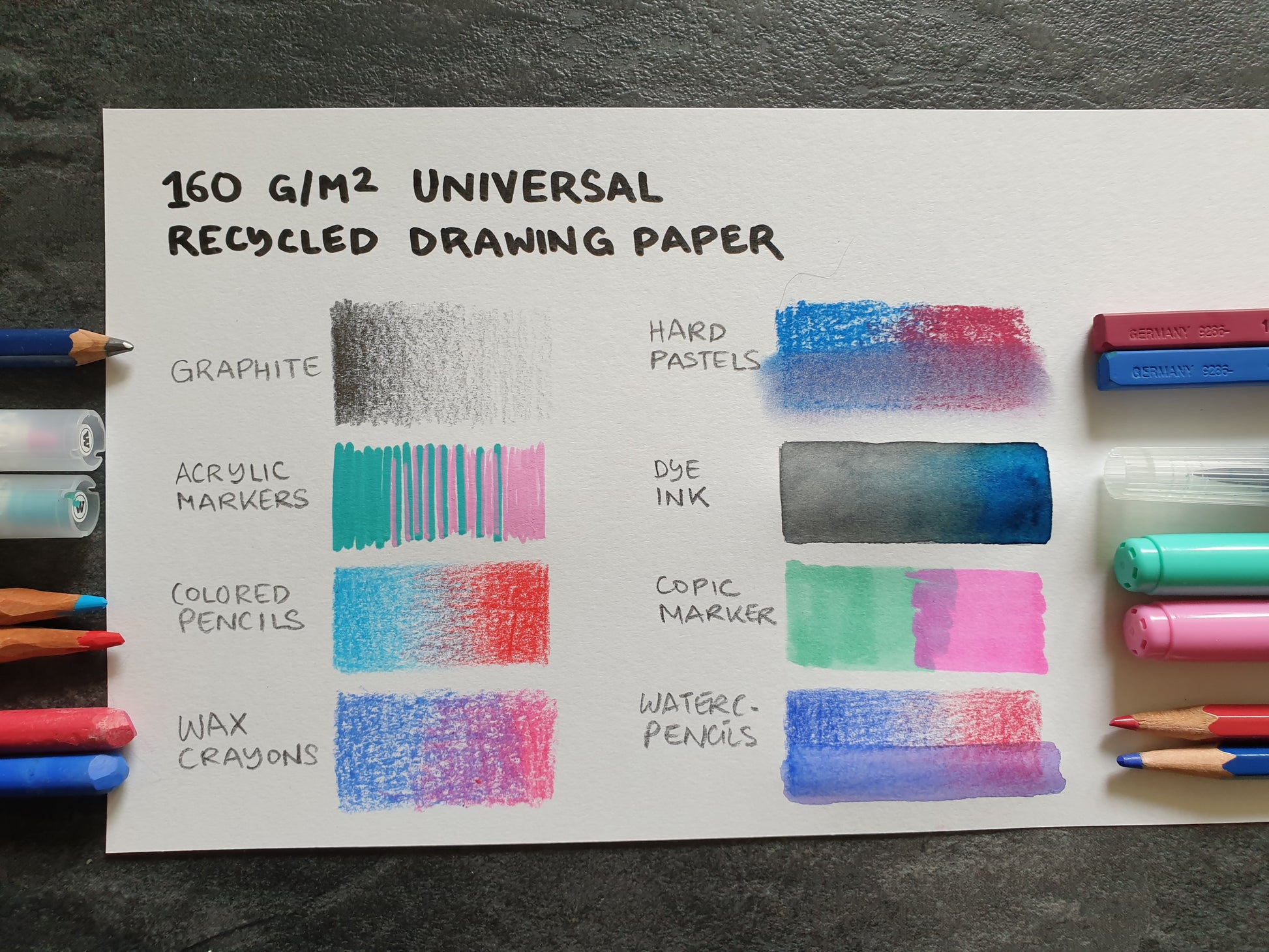 + Glattes Papier, geeignet für Mixed Media Zeichnungen. Das Papier funktioniert am besten mit Graphit & Acrylmarkern (siehe Fotos des Papiertests). Obwohl es gut für Farbstifte, Wachskreiden und Pastell geeignet ist, ist das Papier zu glatt um mehrere Schichten zu malen. Das Papier wellt sich schnell wenn Wasser verwendet wird. Es ist nicht geeignet für Copic Marker.