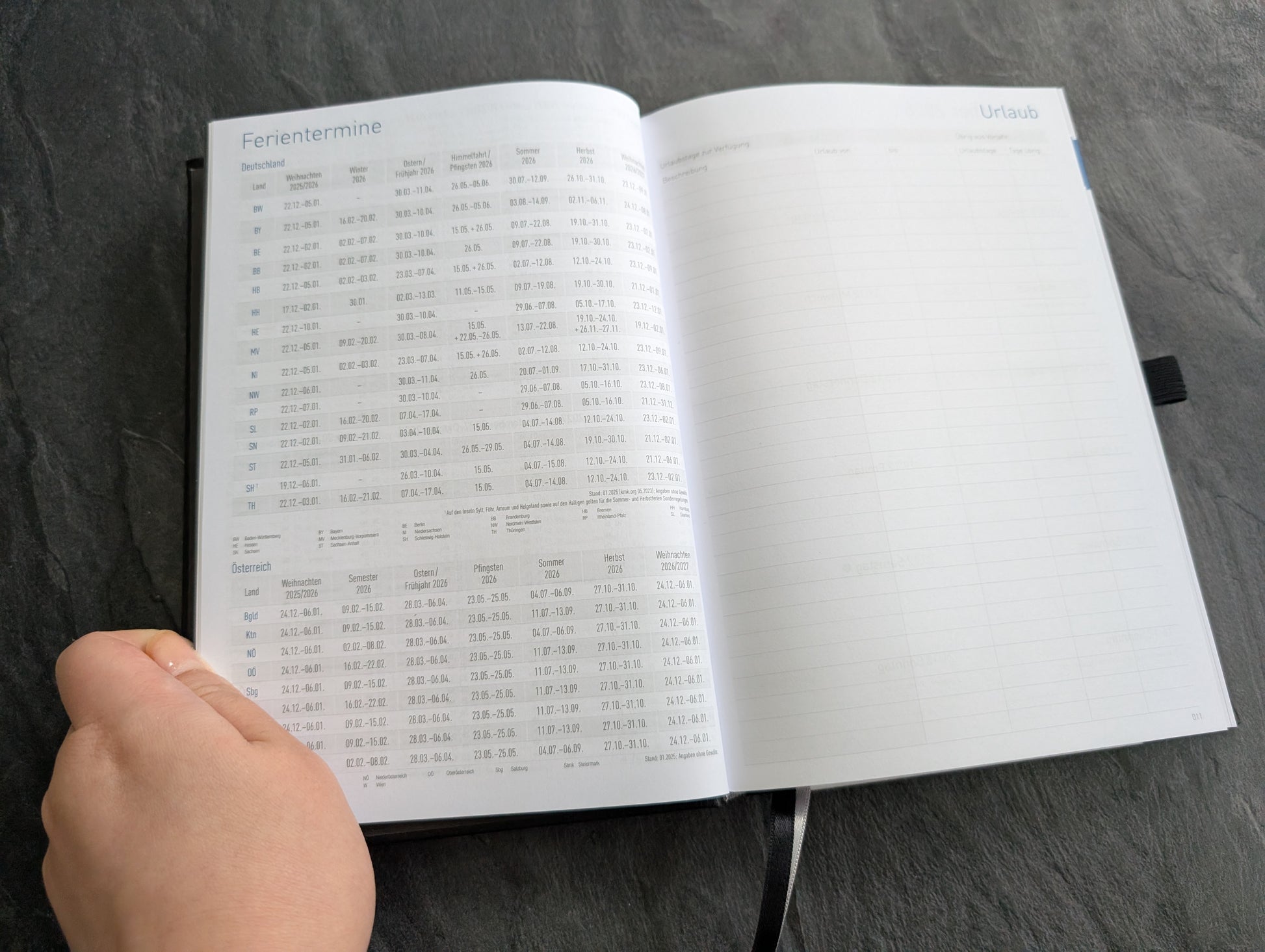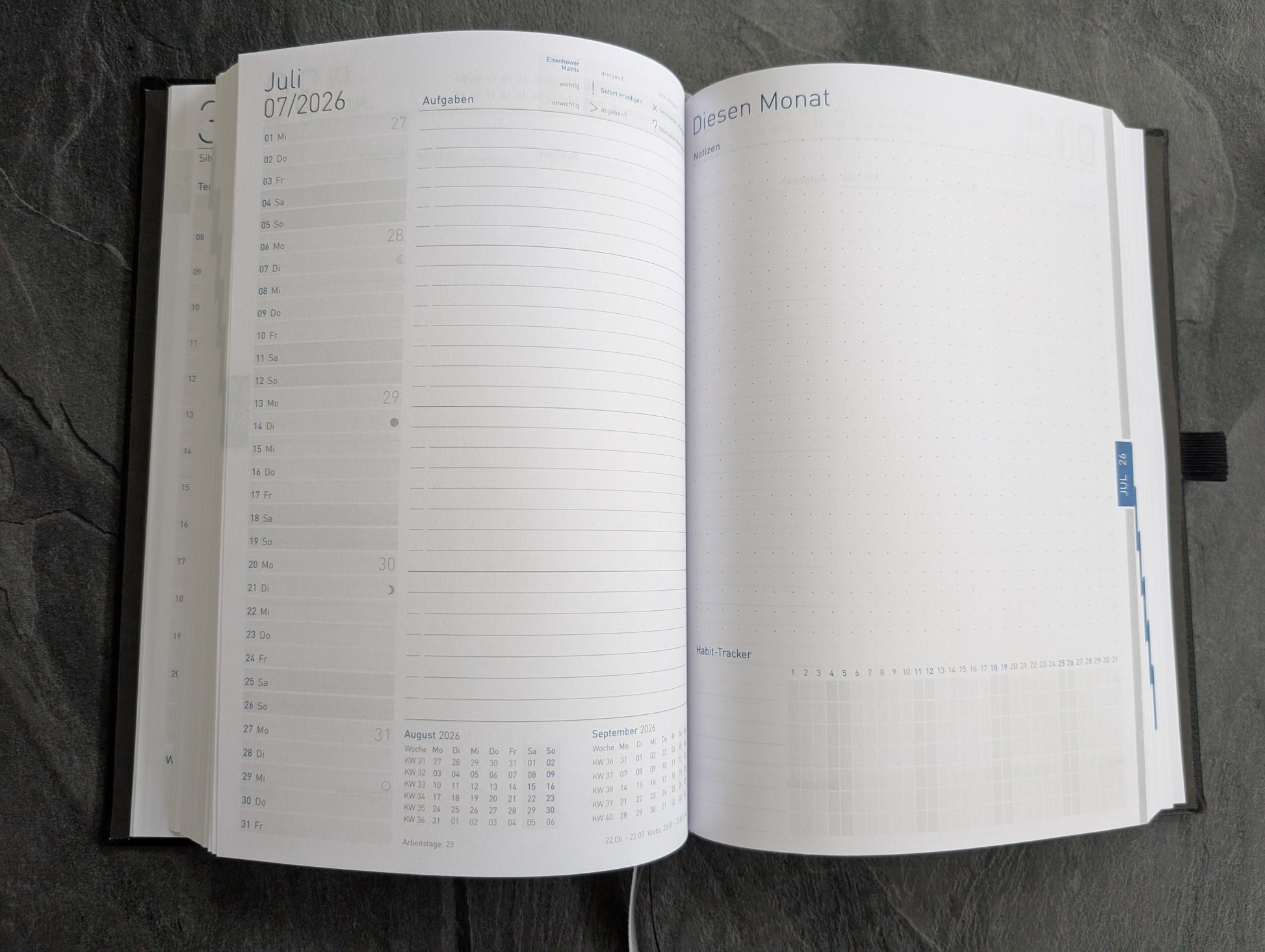 Tagesplaner 2026, pro Werktag 1 Seite (Sa/So auf einer gemeinsamen Seite), plus Monatsübersichten mit je einem Habit Tracker, sowie praktischen Bonusseiten wie z.B. Notrufnummern und Ferienübersicht. Jeder Tag hat 3 Spalten, je eine Spalte für Zeiten/Termine, Notizen und Aufgaben.