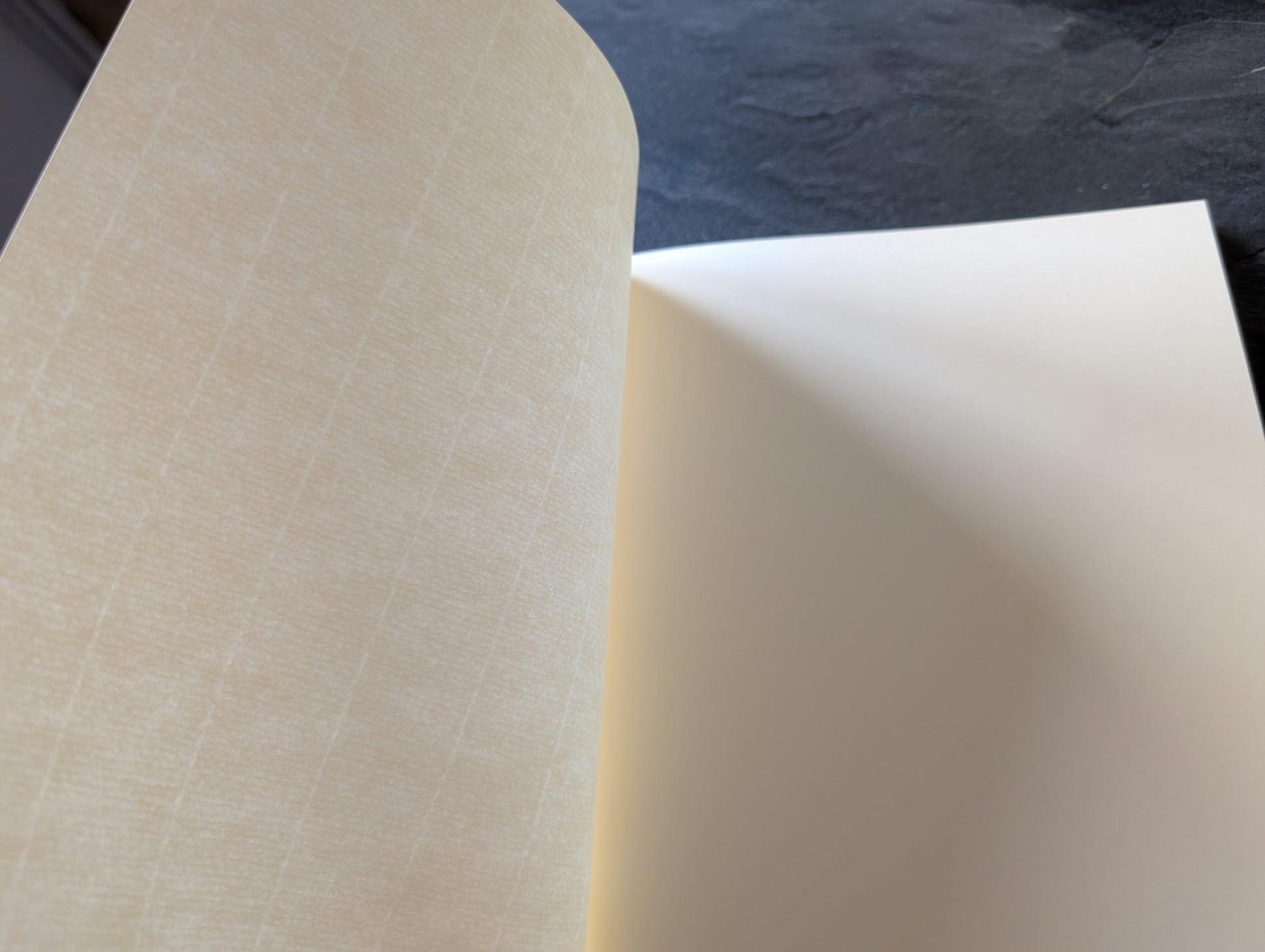 Wenn man das Papier gegen das Licht hält, ist eine Rippenstruktur als eine Art Wasserzeichen im Papier zu erkennen. Ein sehr edles Papier!