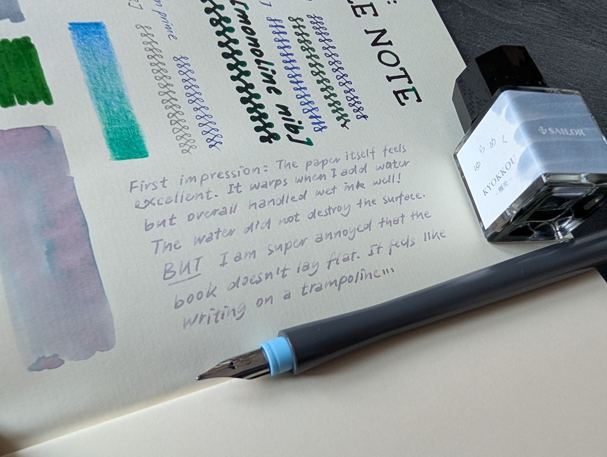 Als ich es getestet habe, hat das Papier auch einen nassen Pinsel und große Tintenflächen gut vertragen. Das Papier wellt sich dann, aber die Oberfläche franst nicht aus. Siehe Foto. Das Papier ist eher nicht geeignet für Farbstift (zu glatt) und Alkoholmarker (schlägt durch).