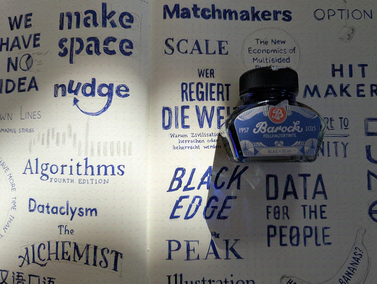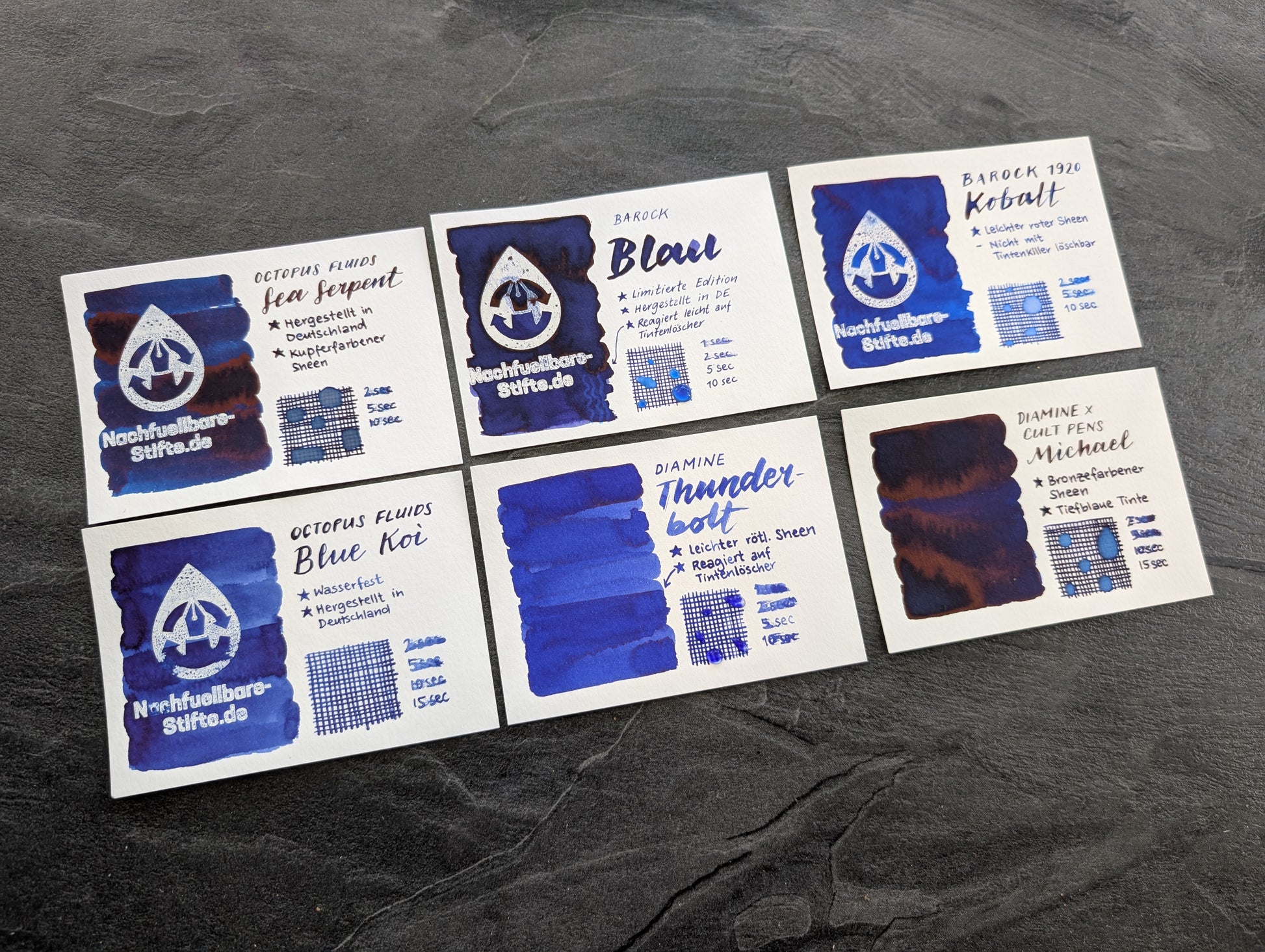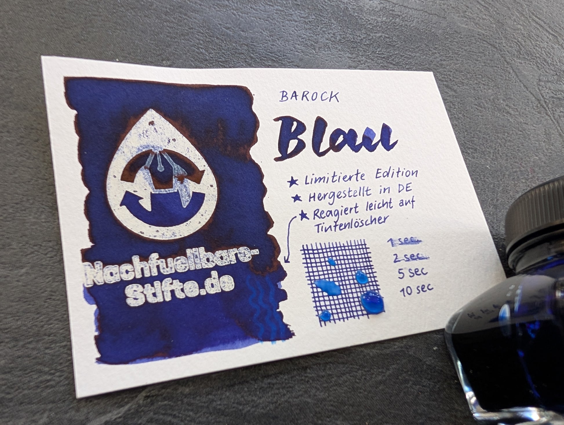 Eine tiefblaue Tinte mit leichtem rötlichen Sheen. In dekorativer Glasflasche, mit Etikett versiegelt. Die Farbe ist NICHT löschbar mit Tintenkiller. Aber die Tinte wird etwas heller davon.