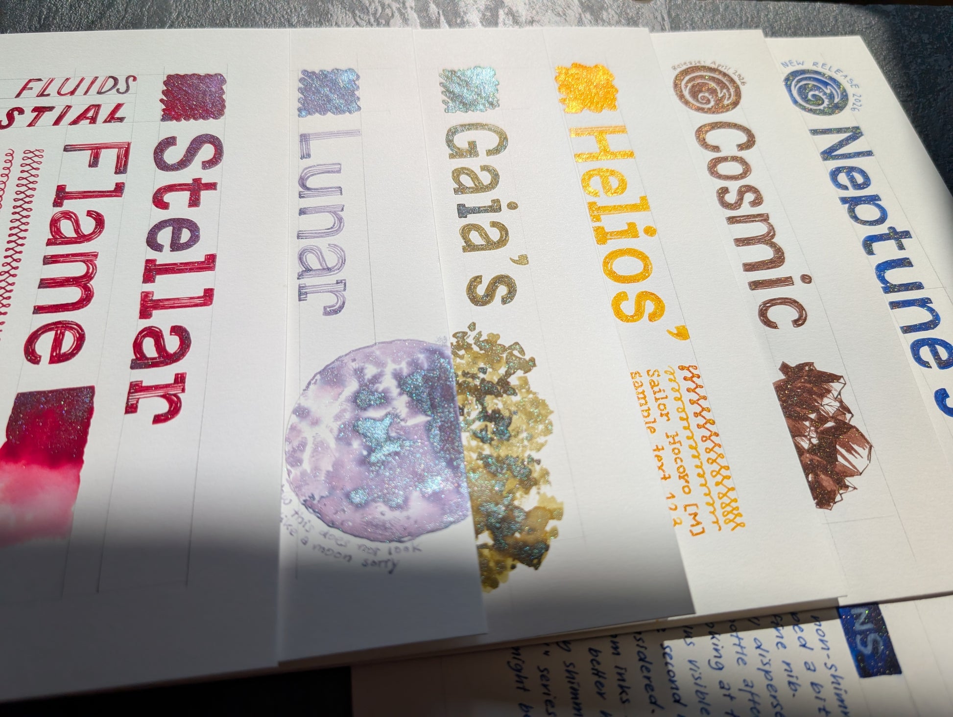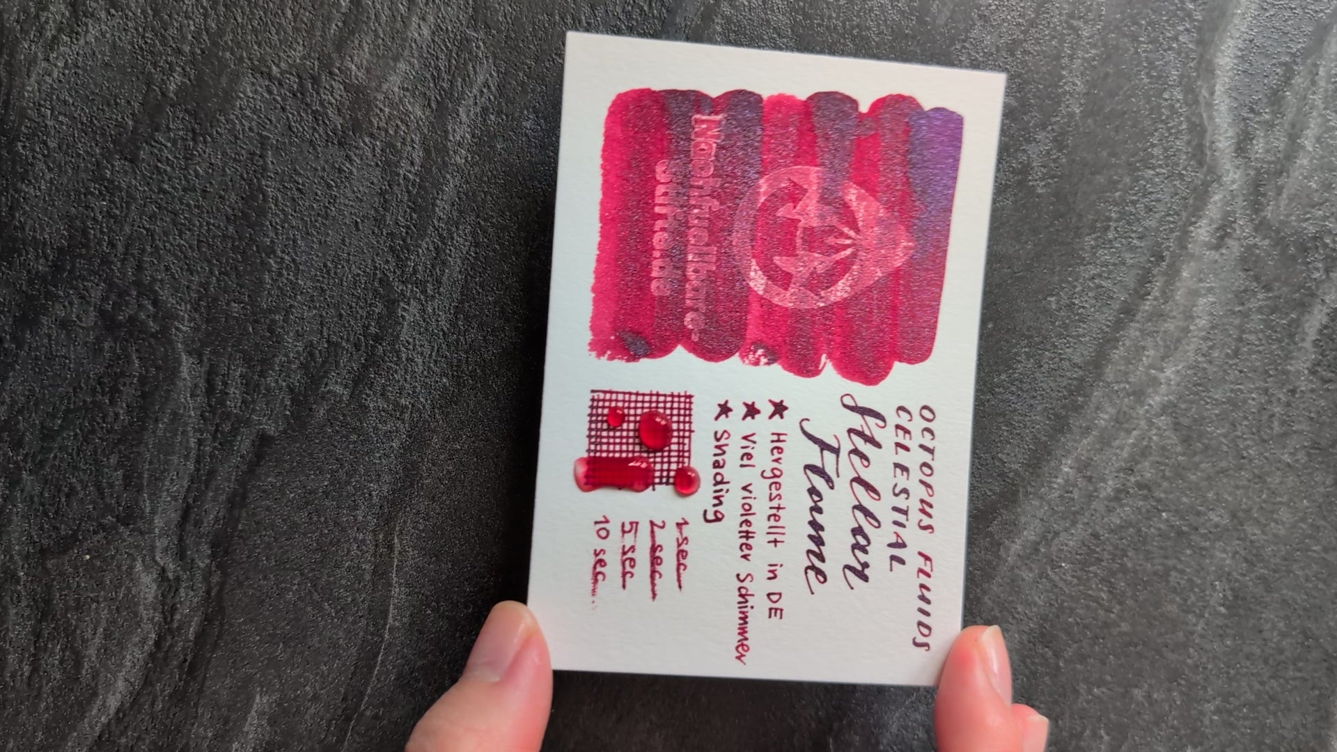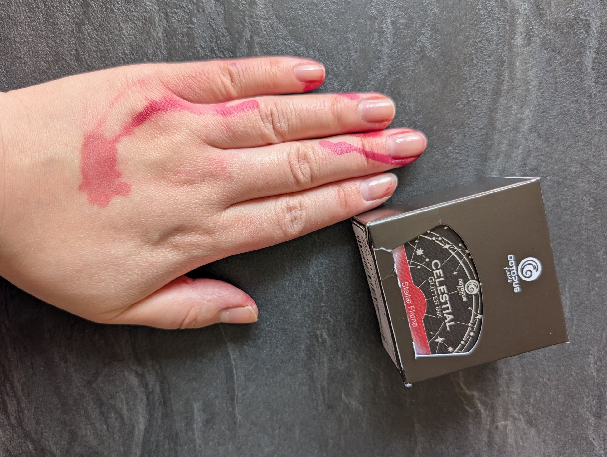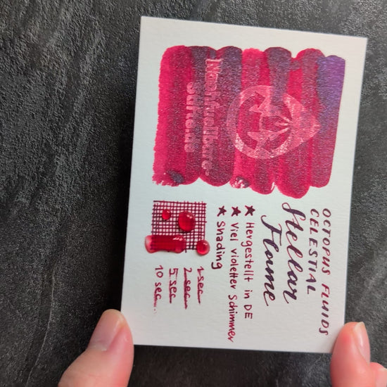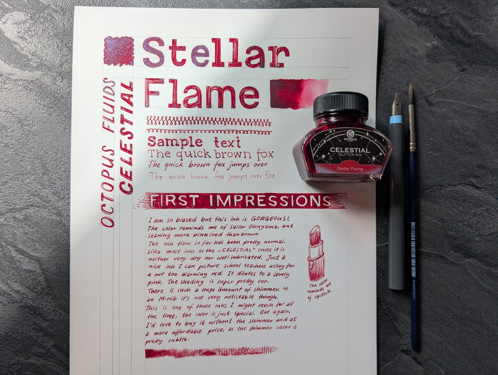 Die Formel der Celestial Tinten hat es irgendwie geschafft, dass die Glitzerpigmente extrem lange in der Tinte "schweben" und sich sehr gleichmäßig verteilen. Man merkt es bereits am Tintenglas, dass die Partikel nicht unten am Boden kleben & schon durch ein leichtes Schwenken verteilt werden.