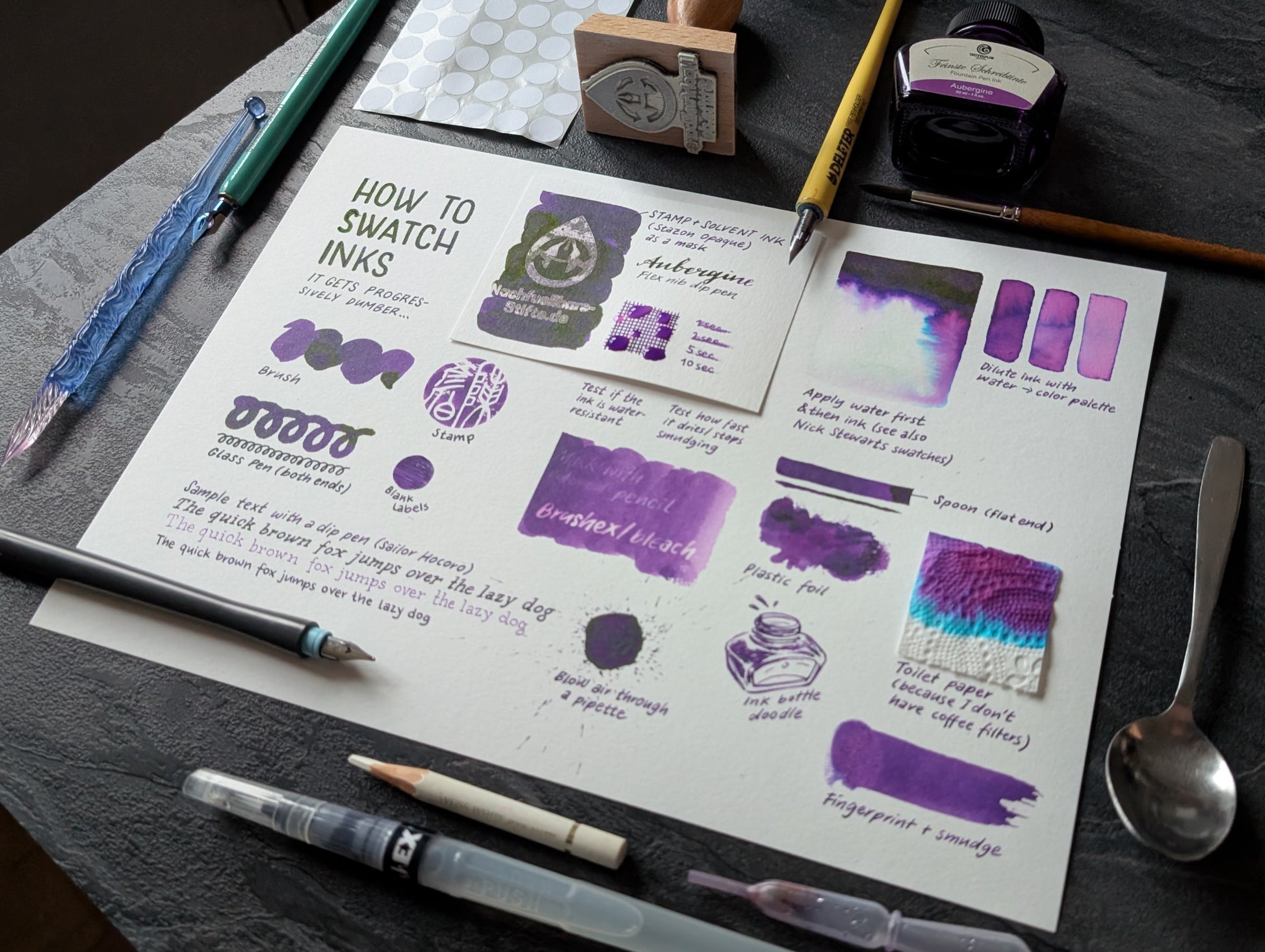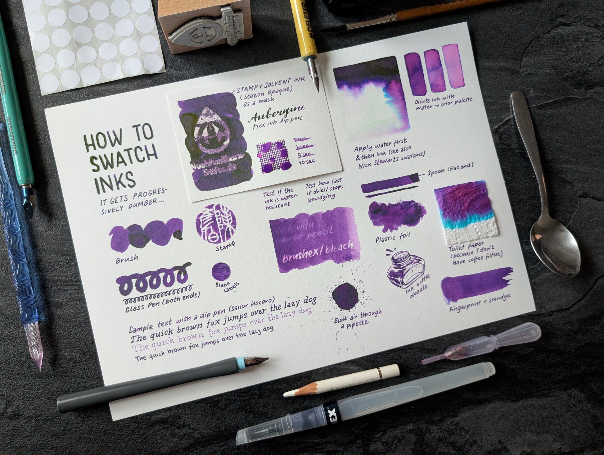 Die Octopus Fluids Classic-Kollektion enthält 22 Tintenfarben. Hier die Variante "Aubergine", eine dunkelviolette Tinte mit einem leichten grünlichen Sheen. Dieser Sheen kommt besonders gut zur Geltung auf beschichteten Papieren und/oder einer breiten Feder.