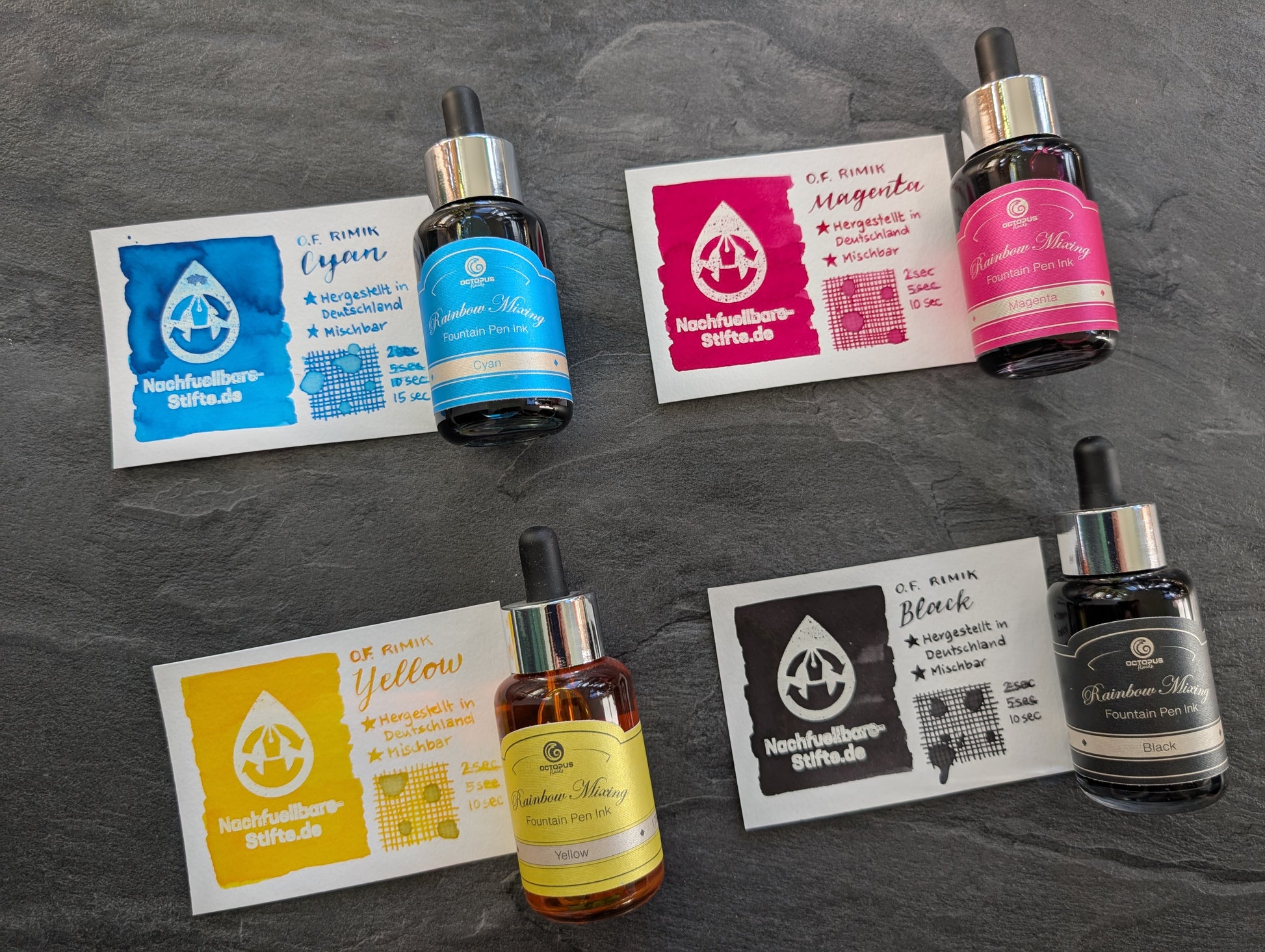 Mischbare Octopus Fluids RIMIK Einzelfarben: Cyan, Magenta, Yellow, Black; 50ml Glasflakons