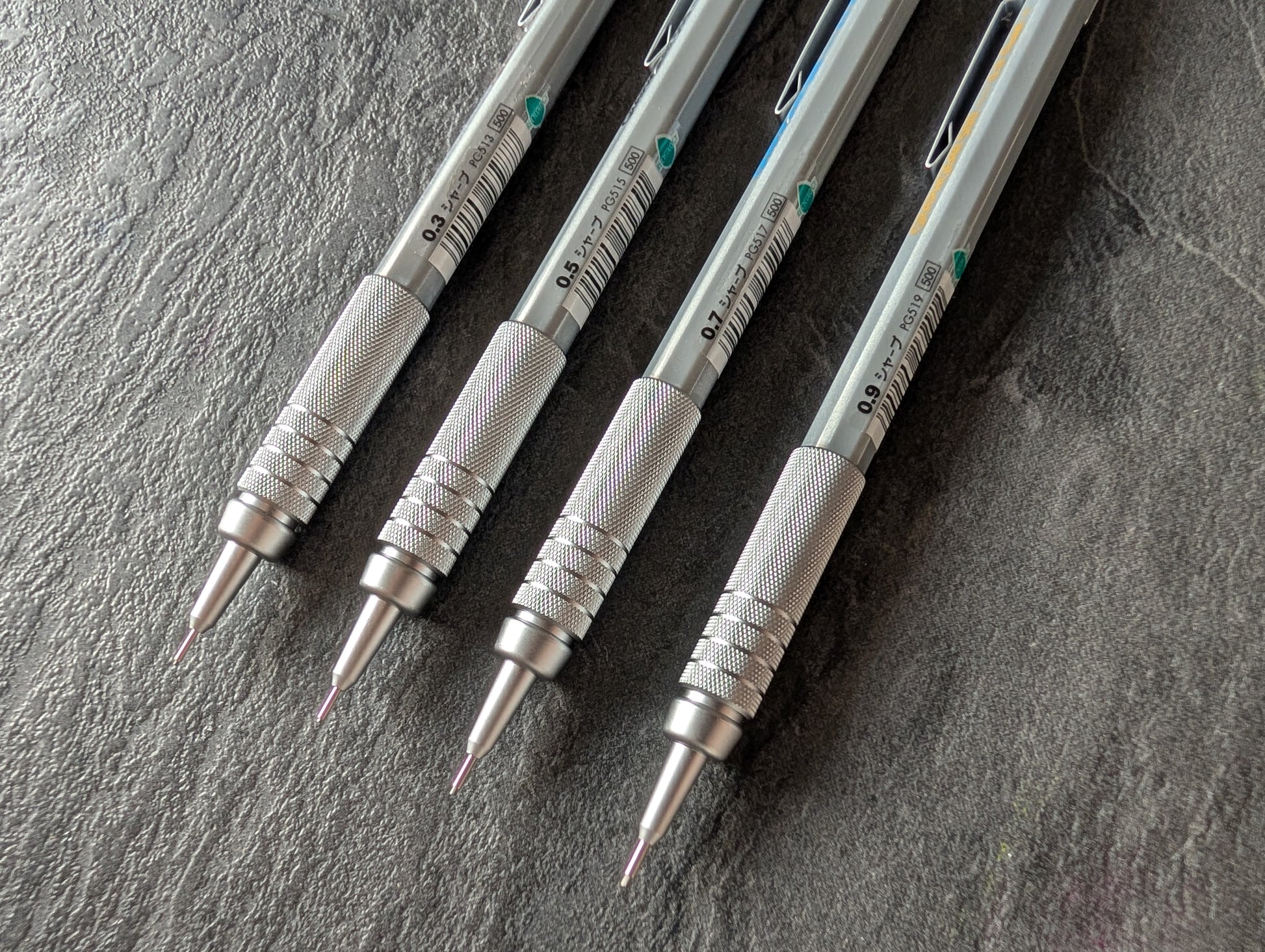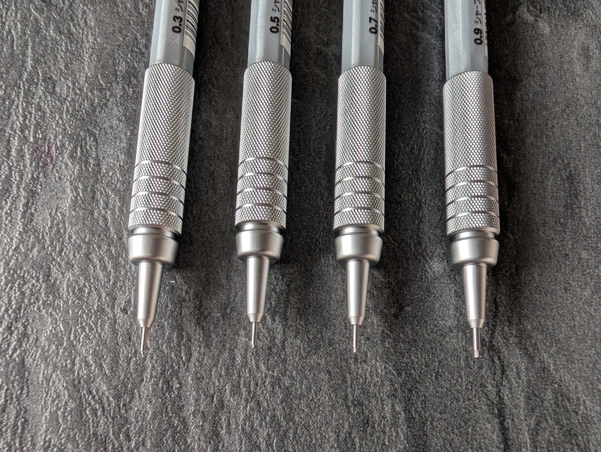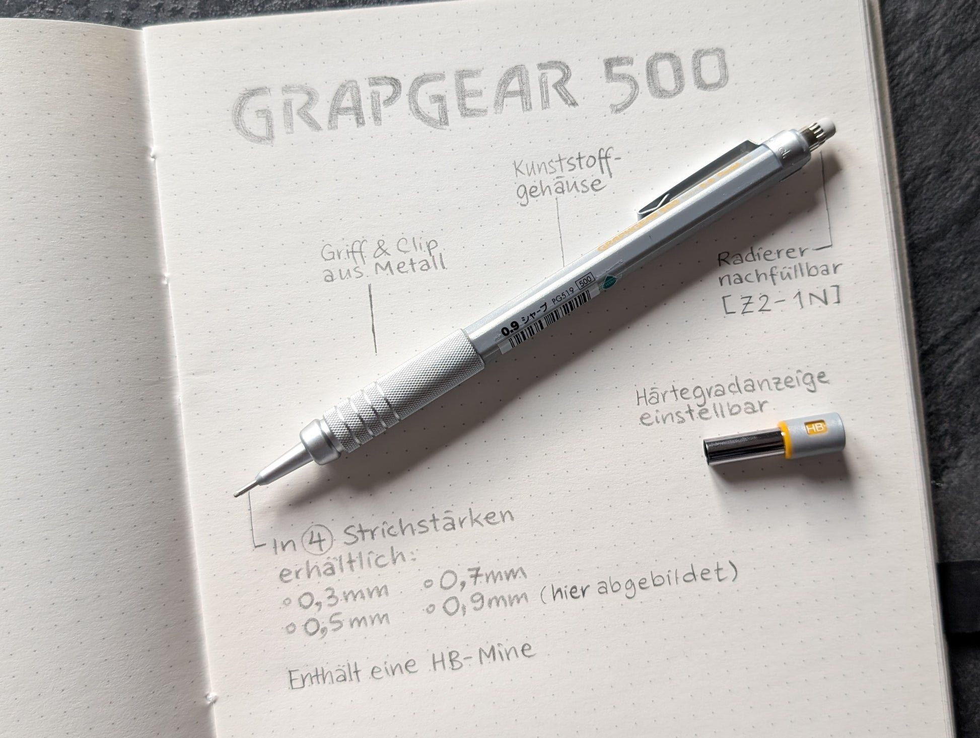 Das Gehäuse ist aus Plastik, der Griff & Clip sind aus Metall. Dadurch ist er leichter und günstiger als vergleichbare Stifte wie Staedtler 925 und Rotring 600. Durch die lange Minenführung ist er sowohl für niedrige Schreib-/Zeichenwinkel geeignet als auch für Schablonen.