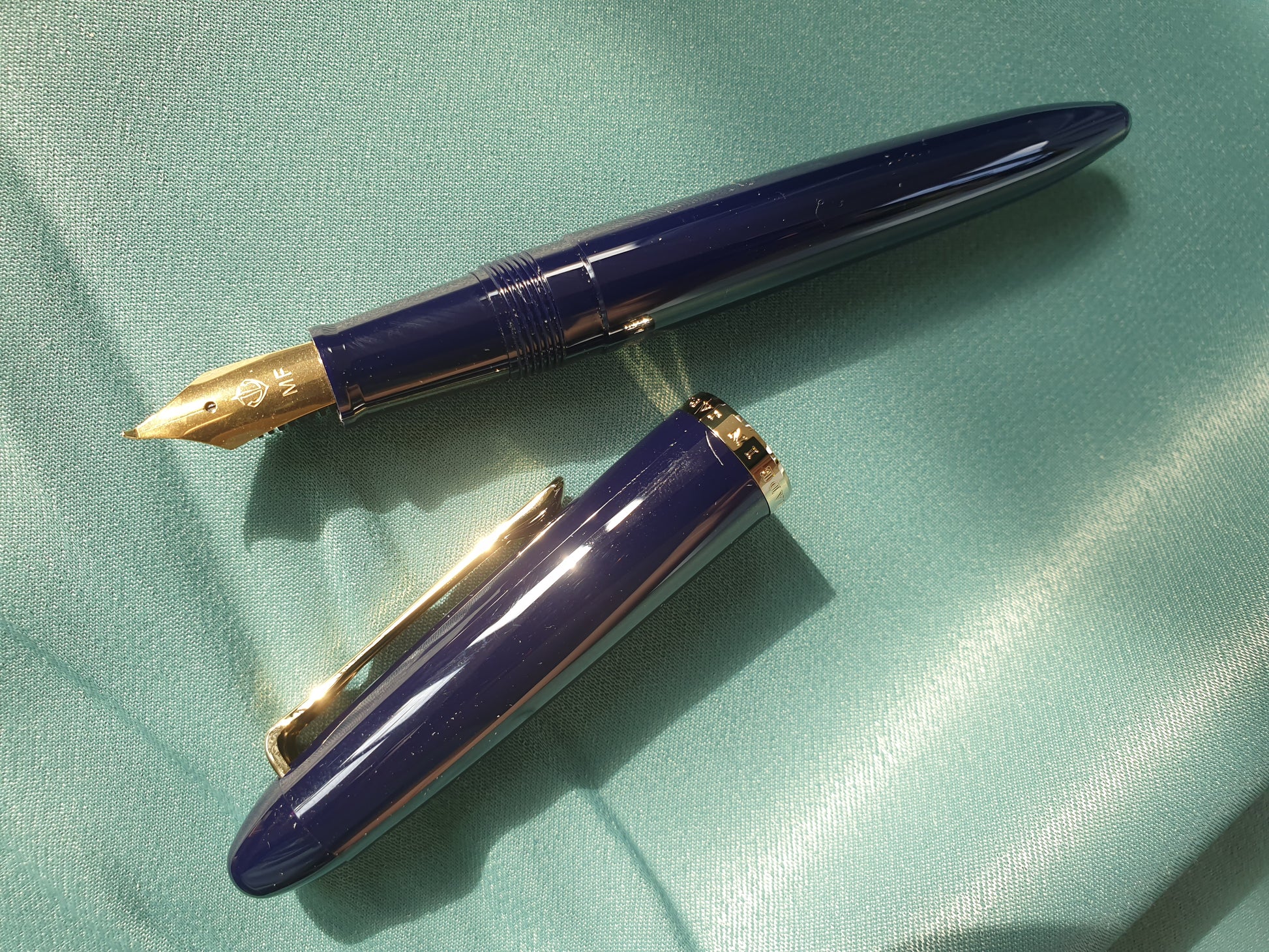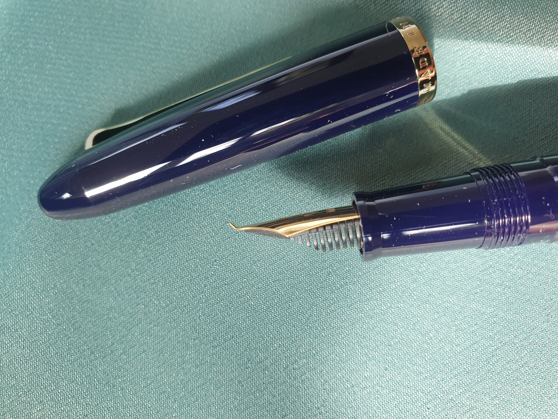 + Goldfarbene Feder, blau-schwarzes Gehäuse mit goldfarbenen Akzenten.