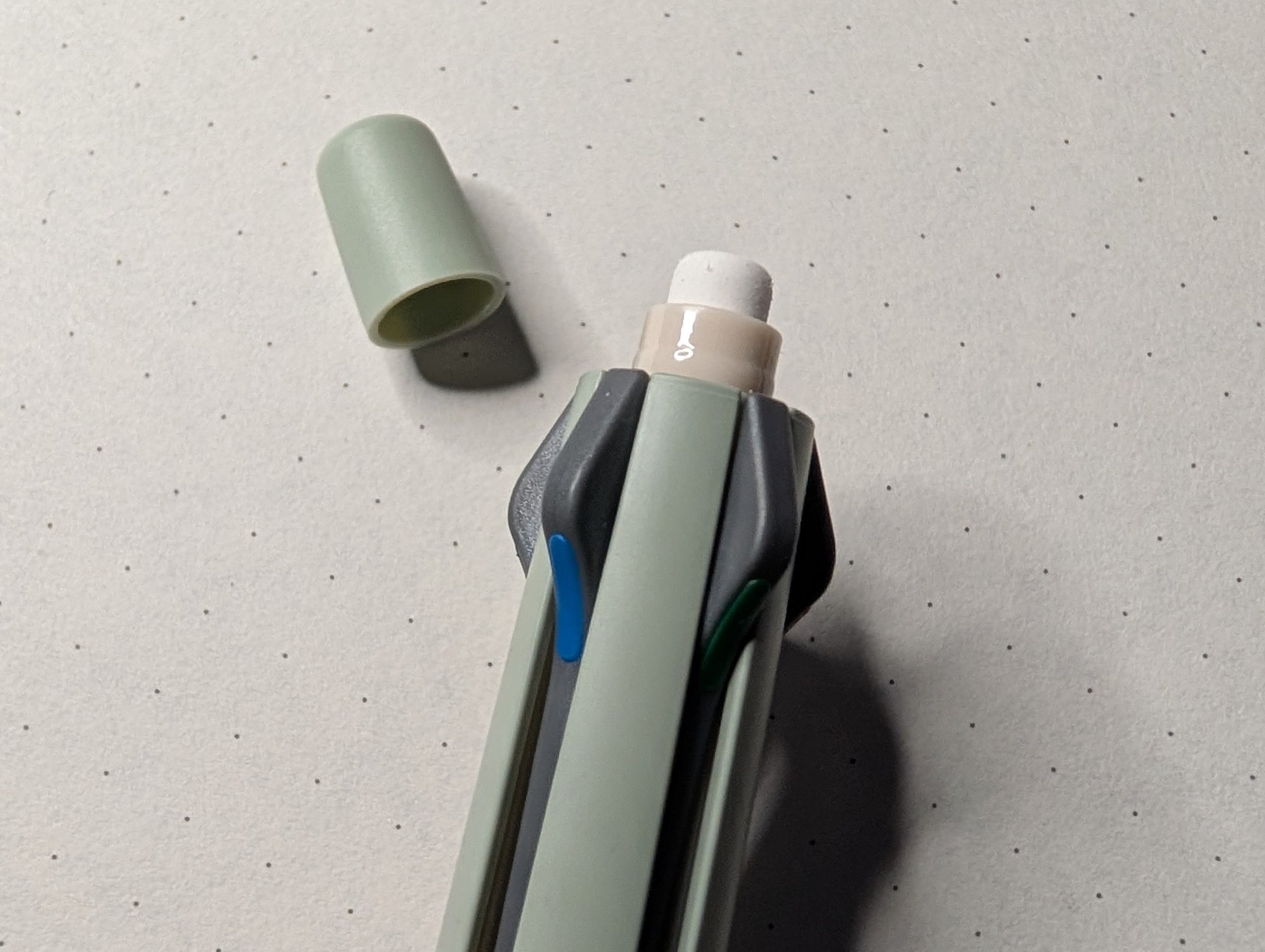 + Der Multistift enthält 4 Kugelschreiberminen und einen Druckbleistift-Mechanismus für 0,5mm Minen. Oben unter der Kappe ist ein Radiergummi integriert.